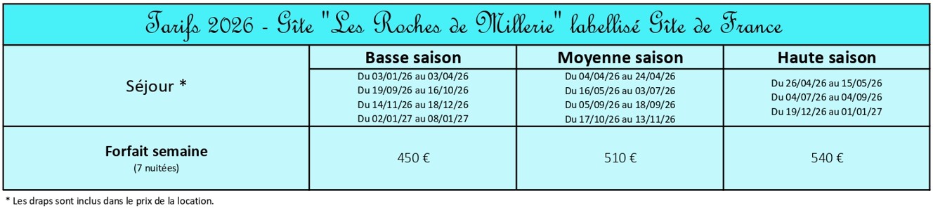 Le tarif comprend la location du gîte pour 6 personnes pour 1 semaine (Du samedi au samedi).